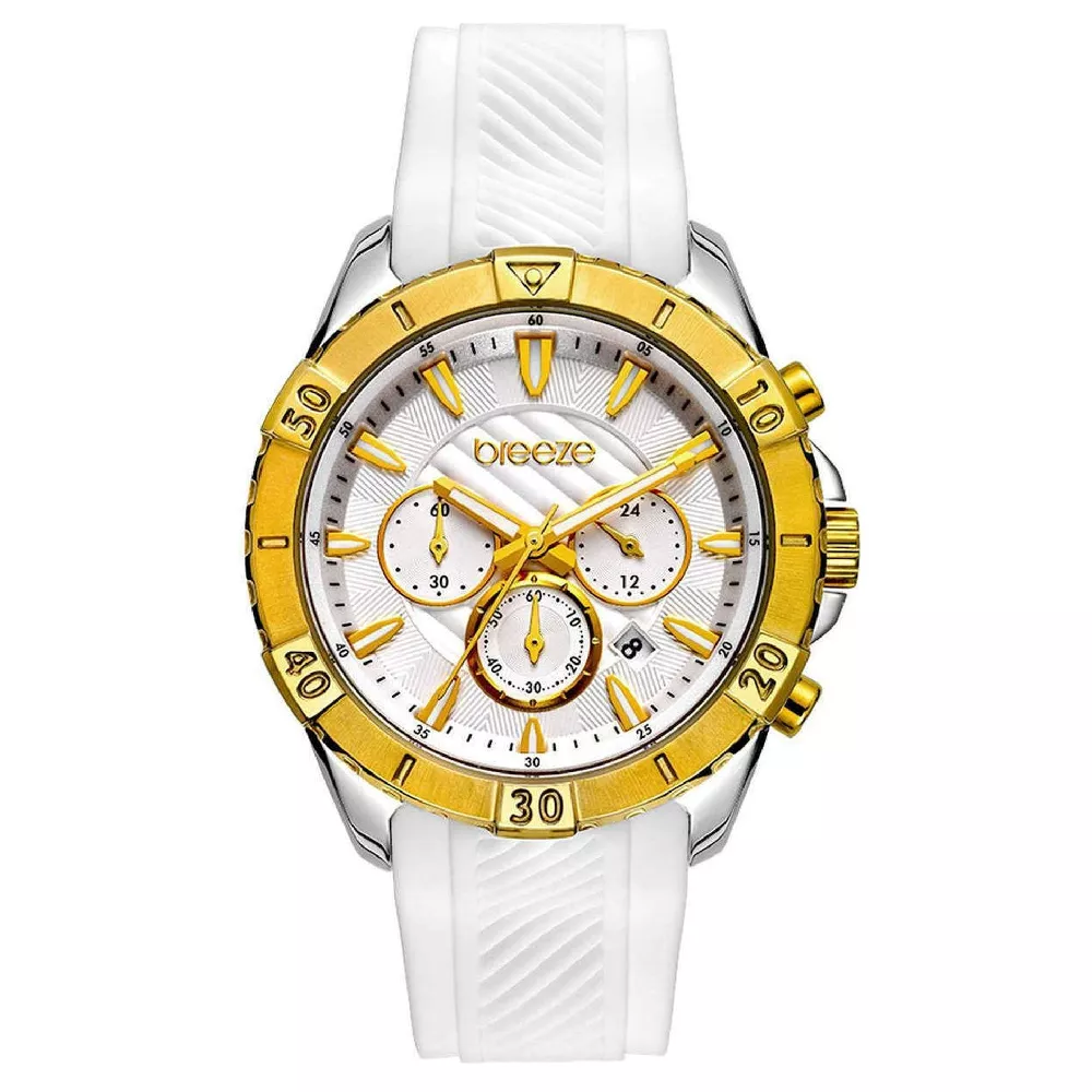 Moderan i atraktivan ženski ručni sat poznatog Grčkog brenda Breeze. Njegov dizajn krasi kućište u boji žutog zlata, brojčanik bele boje sa dodatnim funkcijama kao i silikonska narukvica koja pruža dodatnu udobnost prilikom nošeja sata.