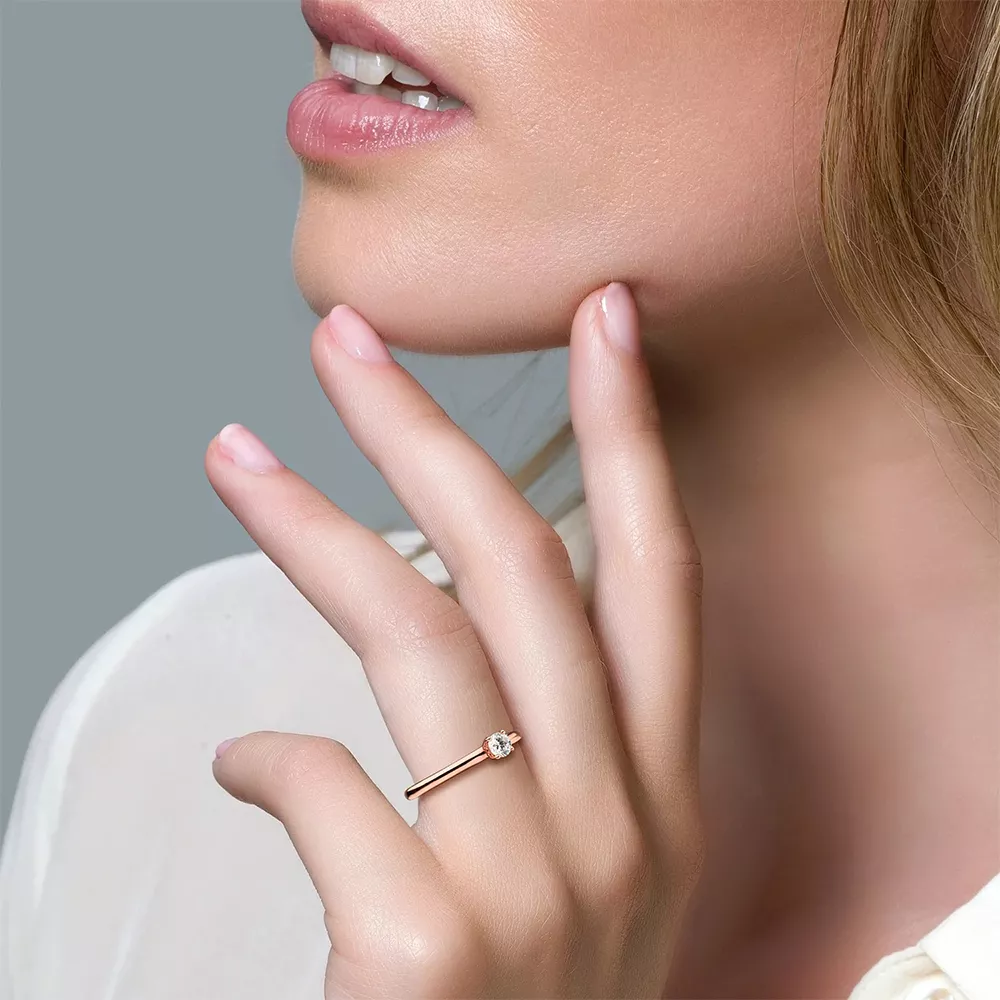 Blush ženski prsten od 14ct blistavo poliranog ružičastog zlata, na čijem centralnom delu se nalazi briljantno brušeni beli cirkon veličine 4mm. Dodatno istaknite svoju nežnu, ženstvenu stranu noseći ovaj elegantni prsten.