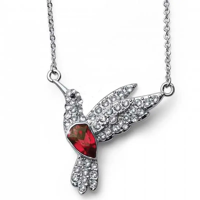 Ženska ogrlica brenda Oliver Weber sa priveskom u obliku ptice koja je ukrašena crvenim i belim Swarovski kristalima.