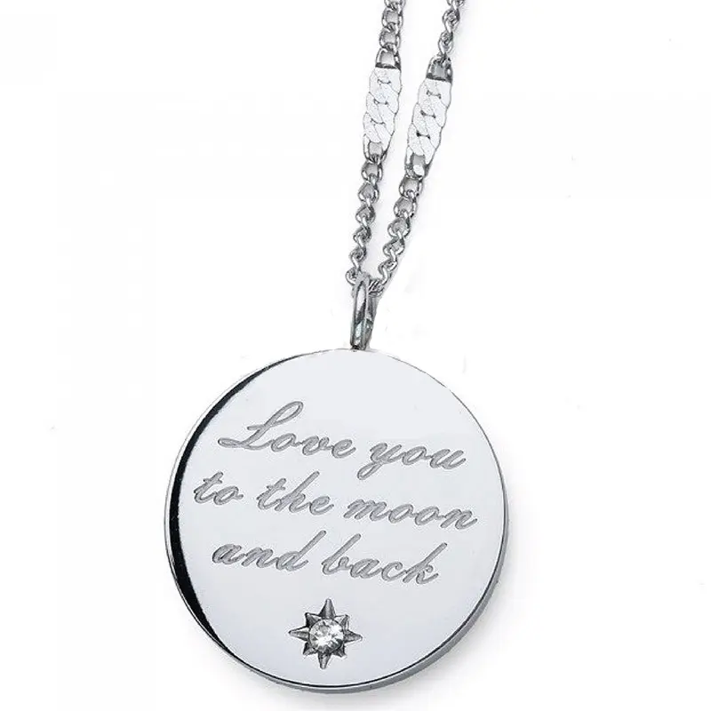 Ženska ogrlica u boji srebra sa priveskom u obliku pločice sa natpisom "Love you to the moon and back". Pogodna za vsakodnevno nošenje.