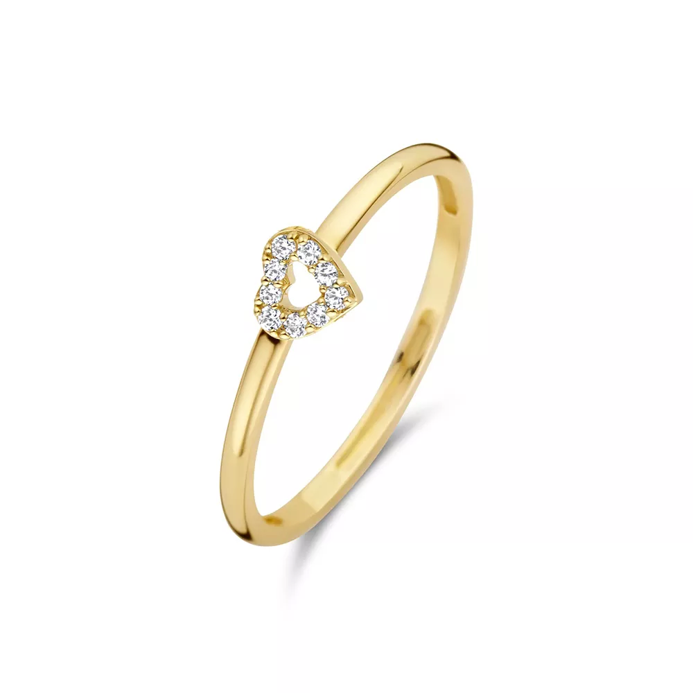 Blush ženski prsten od 14-karatnog žutog zlata, inspirisan motivom ljubavi u obliku srca gde se nalaze umetnuti cirkoni. Ovaj prsten predstavlja savršen odabir kao poklon za voljenu osobu.