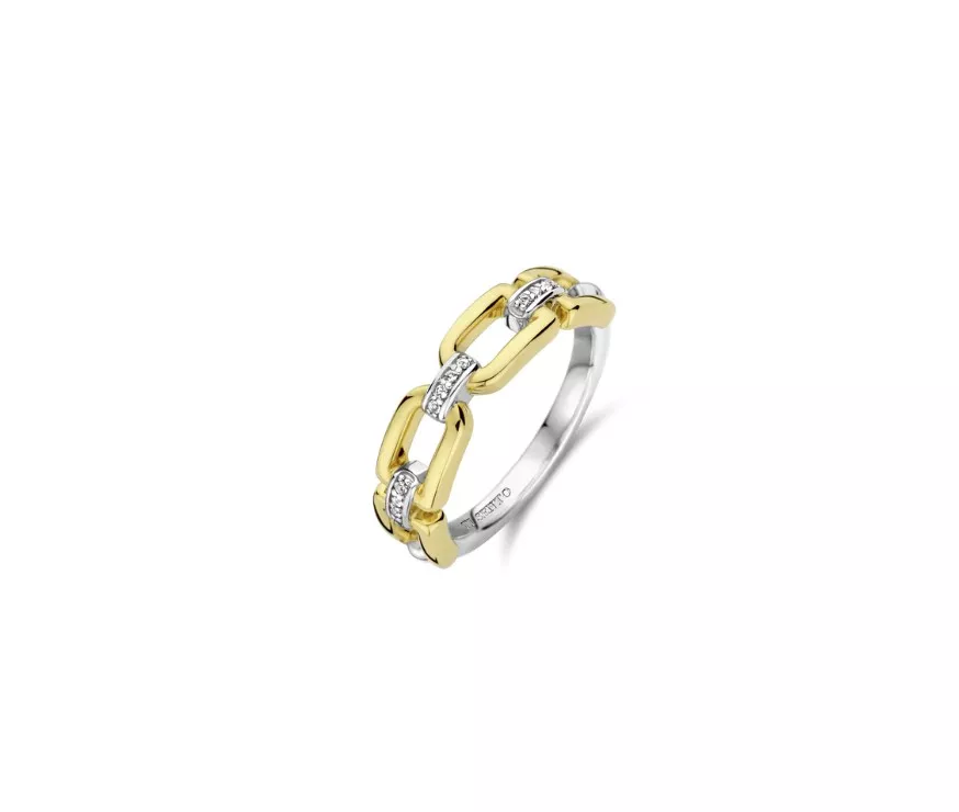 Ovaj TI SENTO pozlac´eni prsten 12321ZI je sofisticirani spoj bezvremenskog dizajna i nenaglašenog glamura. Prsten sadrži žuto pozlac´ene karike koje se drže zajedno sitnim popločanim karikama ukrašenim cirkonima. Izrađen od vrhunskog srebra 925, njegov moderan klasični dizajn odiše elegancijom, što ga čini idealnim dodatkom za ležerne i svečane prilike.