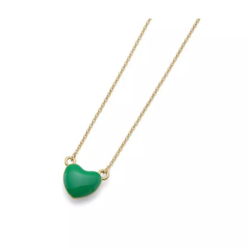 Ženska ogrlica izrađena u boji zlata u kombinaciji sa priveskom u obliku srca zelene boje.
