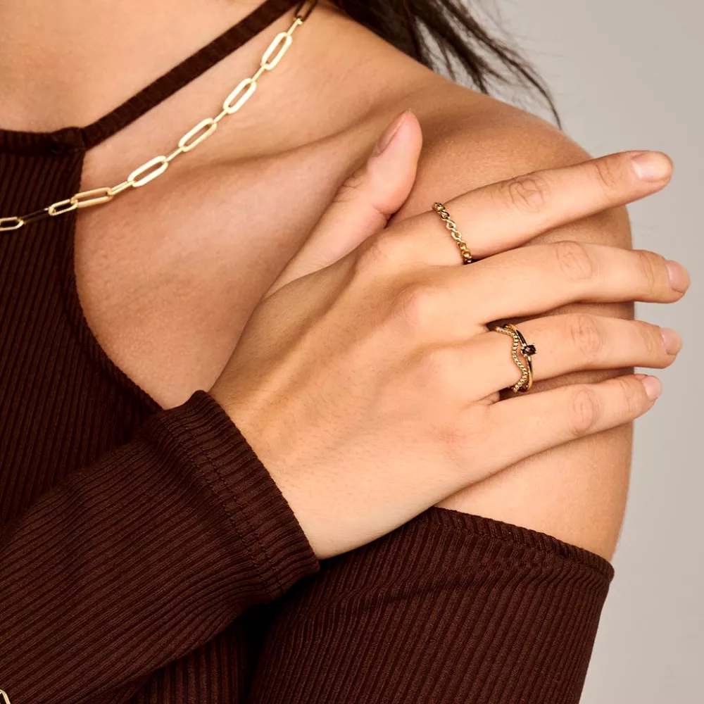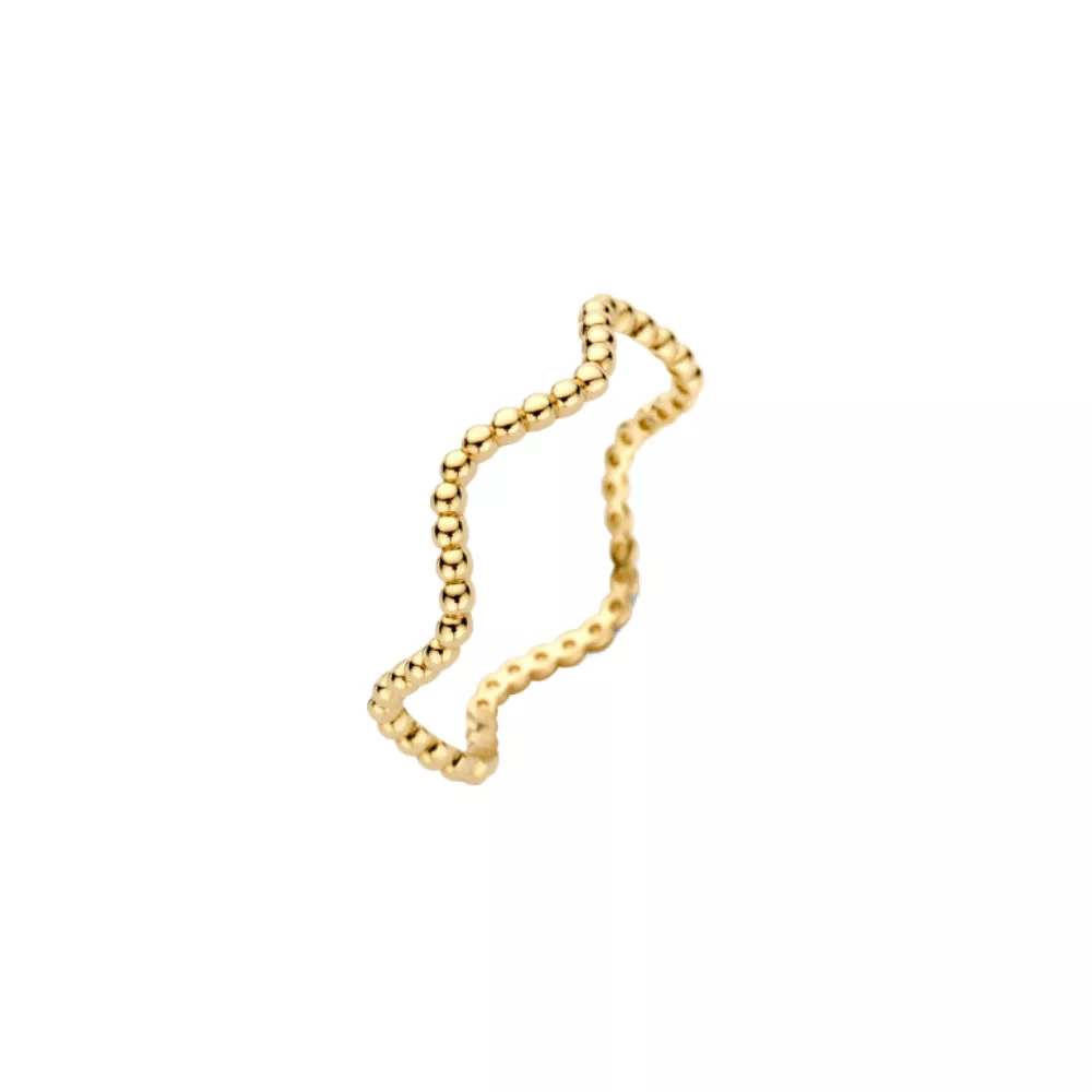 Talasi dizajn sa tačkicama čine ovaj prsten od 14k žutog zlata pravim atrakcijom. širina narukvice je 1,3 mm. Prsten je dovoljno upečatljiv da se nosi sam, ali se takođe lepo kombinuje sa drugim prstenovima.
