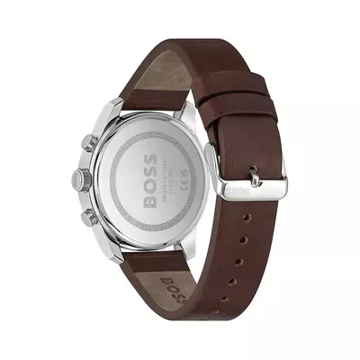 Elegantni muški sat brenda Hugo Boss sa plavim brojčanikom i braon kožnom narukvicom.
