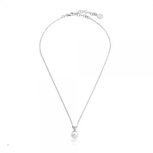 Ogrlica španskog brenda Majorica.Ukrašena je priveskom u vidu bisera,bele boje.Izrađena je od kvalitetnog srebra.