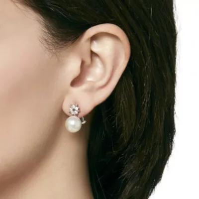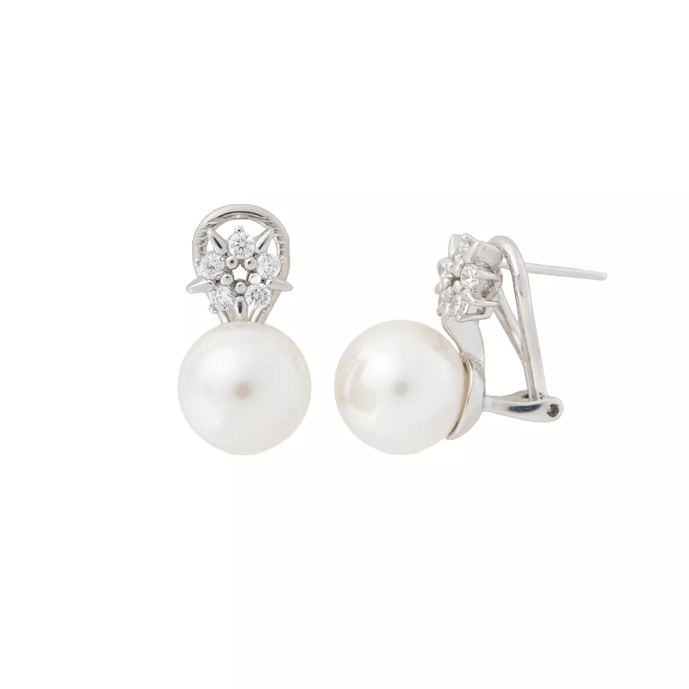 Kratke omega mindjuše sa iglom, od rodiranog srebra, sa belim okruglim biserima prečnika 11 mm i cirkonima. Savršen par čini savršenu kolekciju.