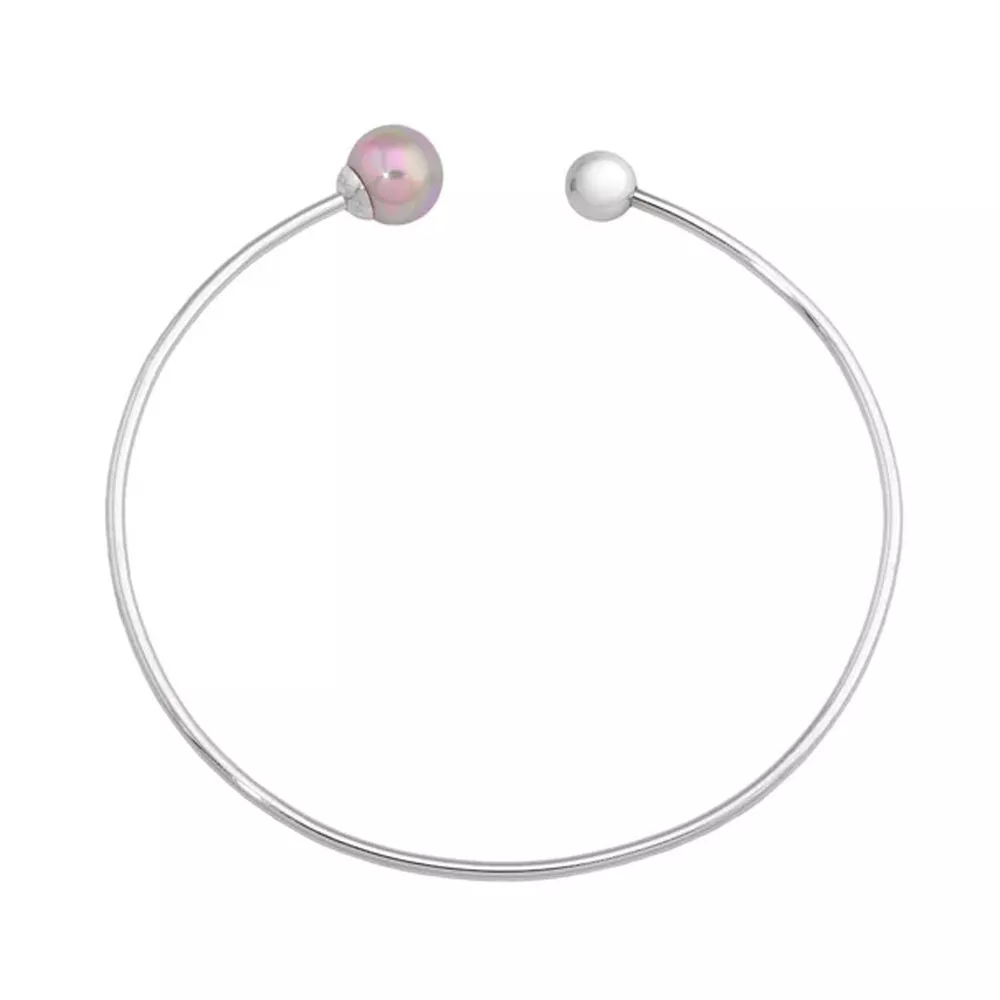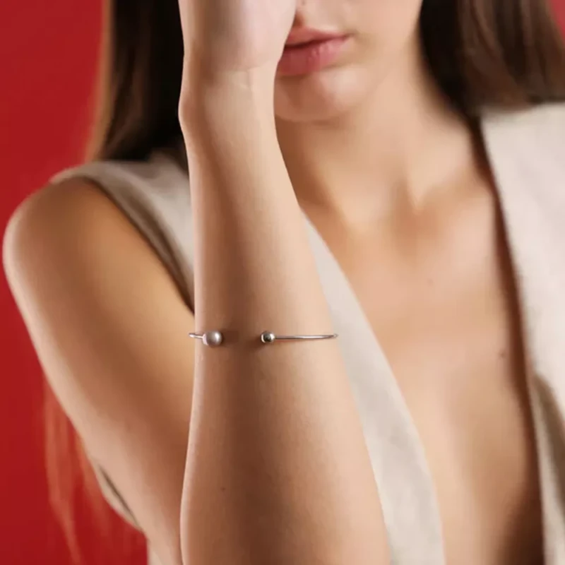 Neobičnu Majorica otvorenu narukvicu u kombinaciji različitih materijala: ćelika i titanijuma krase dva bisera koja ističu njenu eleganciju i sofisticiranost.
