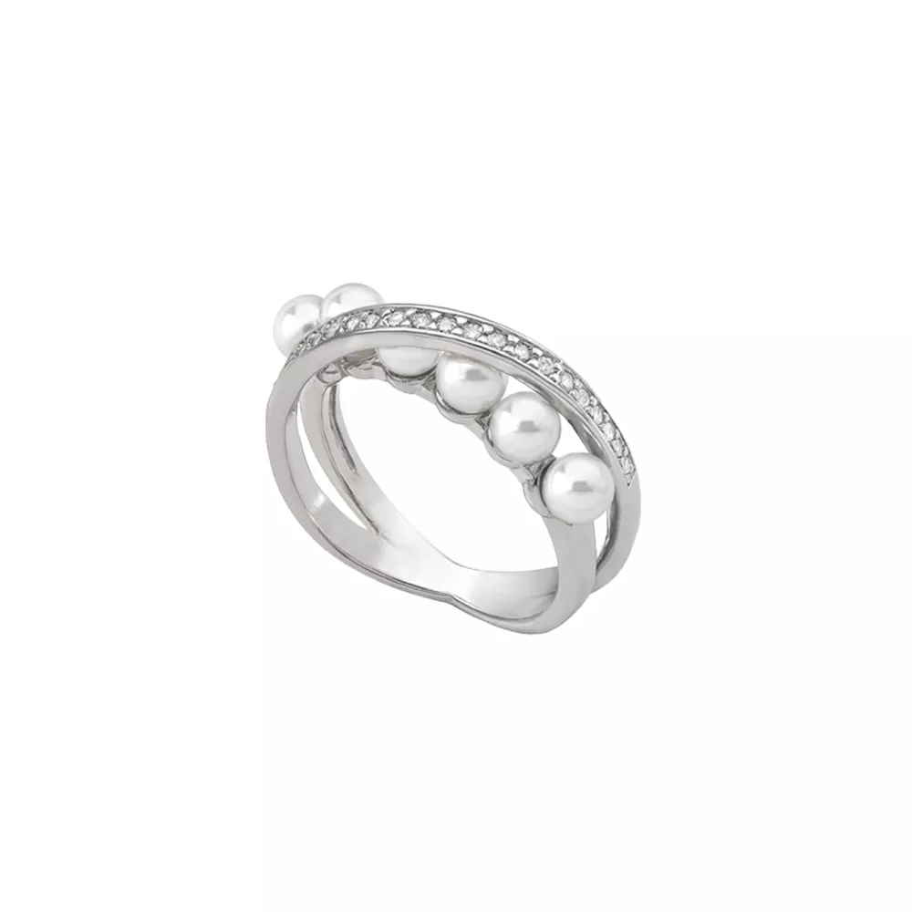 Ovaj prsten zatvorenog tipa je izrađen od rodijumiranog srebra, sa belim okruglim biserima prečnika 4 mm i cirkonima. Zajedno sa biserima, cirkoni preuzimaju glavnu ulogu u ovoj izuzetnoj kolekciji.