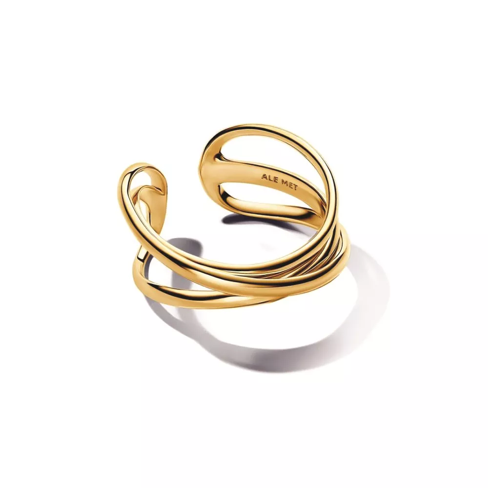 Prigrli jednostavnu lepotu uz organski oblikovani otvoreni prsten sa trostrukom trakom. Tri talasaste žice zaobljenog profila, sa 14k pozlatom, preklapaju se jedna sa drugom sa raspoređenim efektom. Baš kao najlepše kreacije prirode, ovaj prsten sa trostrukom trakom zadivljuje svojom jednostavnošc´u i asimetrijom. Upari ga sa nanizanim prstenovima na drugim prstima za moderan, linearan izgled. Prsten se ne zatvara u potpunosti, ostavljajuc´i mali razmak ispod prsta. Ovaj prsten nije podesiv po veličini i ne treba ga otvarati, savijati ili stiskati.