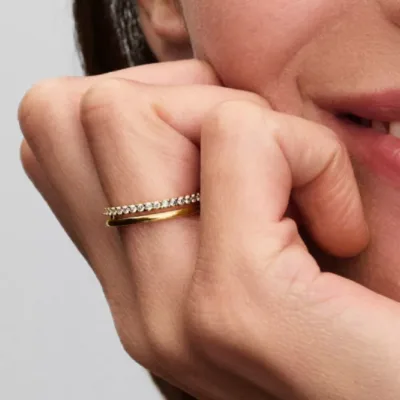 Unesite sofisticiranost u svoj stil uz Pandora Double Band prsten – moderan i elegantan komad nakita koji kombinuje minimalizam i luksuzan sjaj. Ovaj prelepi ženski prsten sastoji se od dva savršeno uklopljena prstena – jedan glatki i klasičan, dok je drugi ukrašen blistavim prozirnim kristalima.