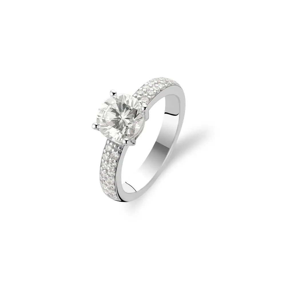 Elegantan ženski prsten brenda Ti Sento. Karakteriše ga predivni, svetlucavi kristal dodatno istaknut diskretnim cirkonima što čini ovaj model upečatljivim detaljem svake odevne kombinacije.