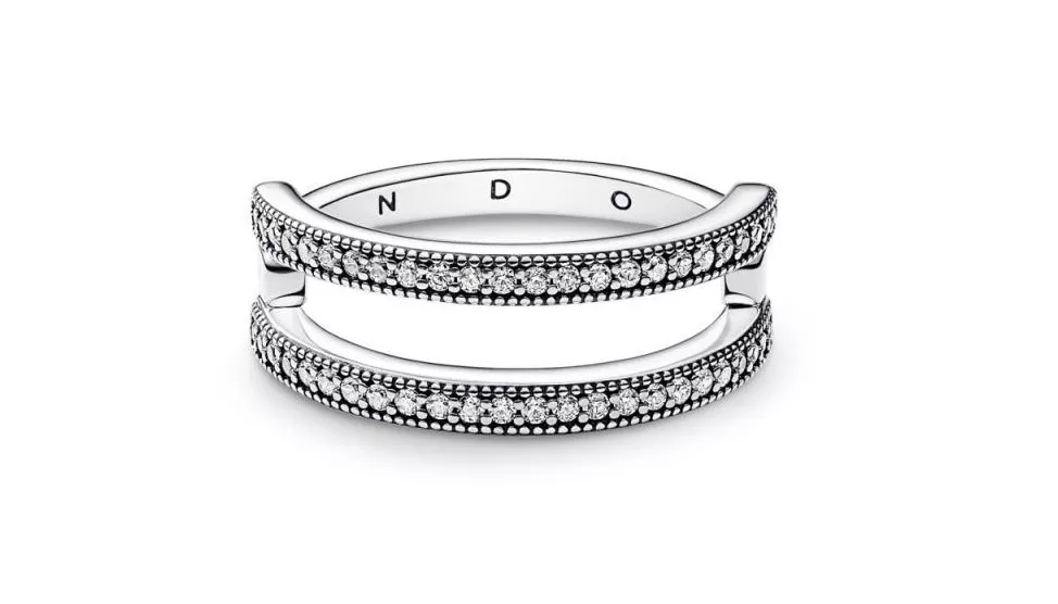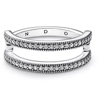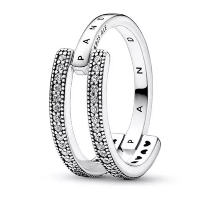 Uzdigni svoj prepoznatljivi niz na viši nivo uz dvostruki trakasti prsten Pandora Signature Logo i pavé. Jedinstveni oblik ovog srebrnog prstena čini ga izuzetnim komadom; jedna polovina sadrži dve paralelne trake sa svetlucavim redovima uokvirenim mikroperlama, druga polovina stvara skulpturni kontrast povezujući dvostruki oblik.