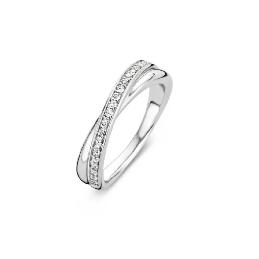 Ženski prsten brenda Ti Sento. Elegantni model neobičnog dizajna sa kombinacijom srebra i reda kristala koji daju potpuniti efekat elegancije.