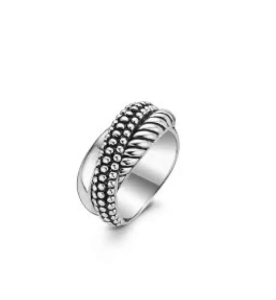 Ženski prsten brenda Ti Sento. Karakteriše ga forma različito dizajniranih uvijenih krugova koja ovom modelu daje atraktivan izgled i čini ga upečetljivim detaljem svake odevne kombinacije.
