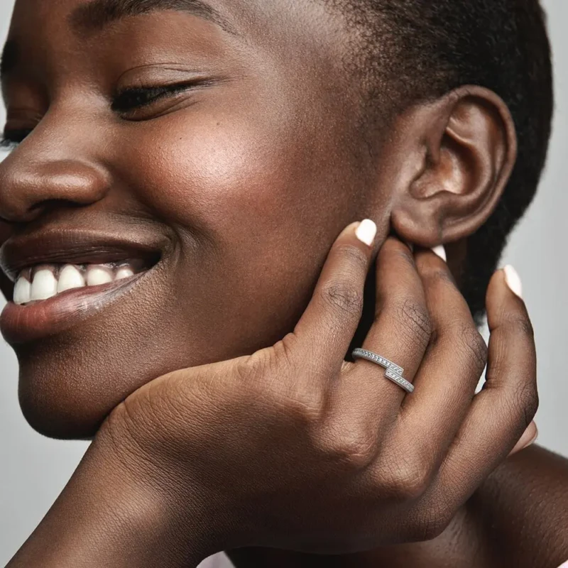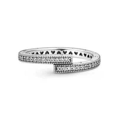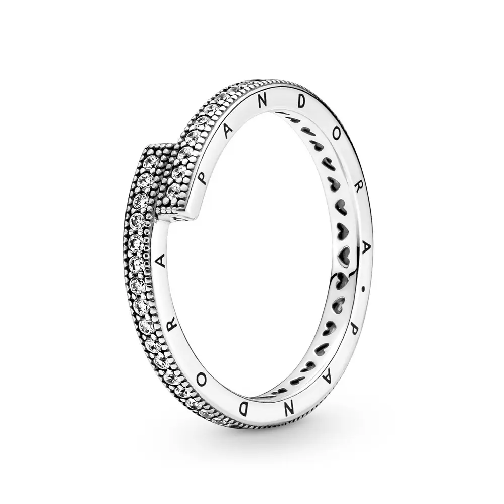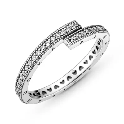 Odlučite se za savremeni minimalizam sa svetlucavim preklapajuc´im prstenom. Ovaj prsten od srebra ima asimetrični dizajn gde se kvadratni krajevi trake blago preklapaju kako bi se stvorili uglovi od 90 stepeni. Spoljna traka sadrži jasne kubične cirkonijeve pave uokvirene mikro perlicama, bočne strane imaju Pandora logo, a unutrašnja drška ima izrezana srca. Na kraju svakog profila nalaze se dva monograma Pandora Crovn O. Potpuno zapanjujuc´i sam po sebi.