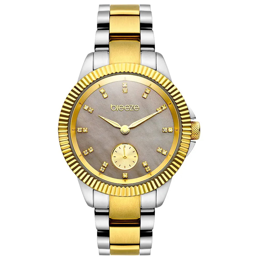 Ženski ručni sat brenda Breeze iz kolekcije Fairymade sa sedefnim brojčanikom na kojem se istuču indeksi sa kristalima zajedno sa hronografom.Kućište u boji zlata savršeno se poklapa uz čeličnu narukvicu u kombinaciji boja srebra i zlata.Svojim dizajnom je pogodan za nošenje kako u svakodnevnim tako i u svečanim prilikama.