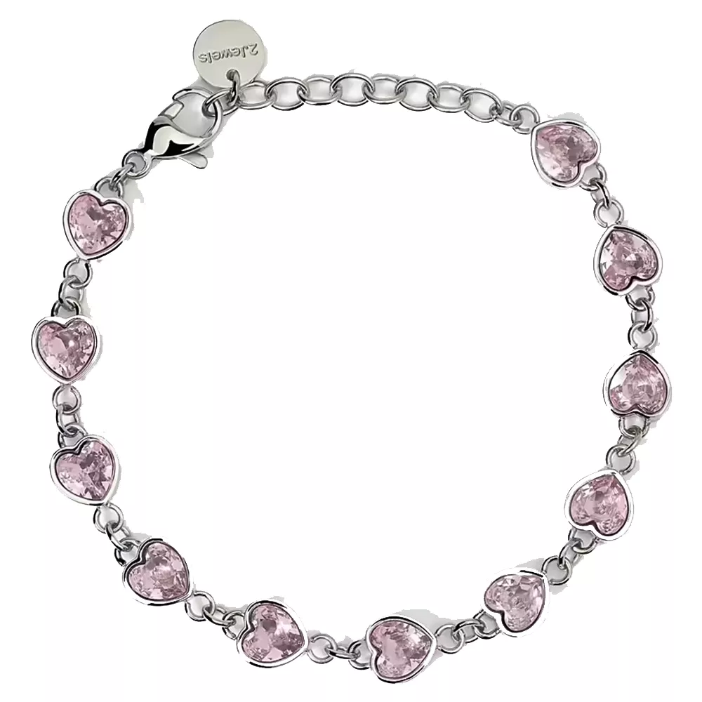 2Jewels ženska čelična narukvica u boji srebra sa ružičastim kristalima. Izrez je u obliku srca, 6×6 mm. Dužina je podesiva od 16 do 19,5 cm.