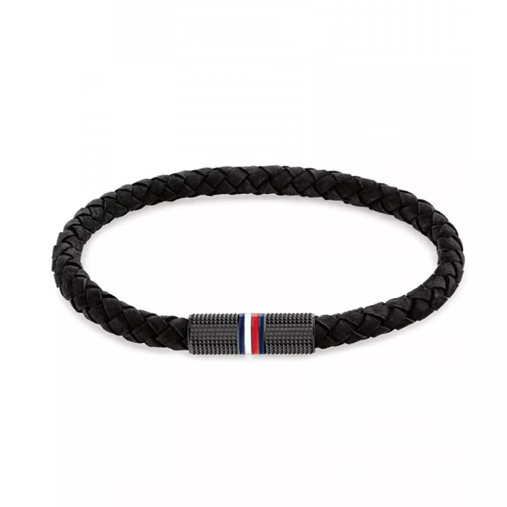 Muška narukvica brenda Tommy Hilfiger od kože u crnoj boji sa pločicom na kojoj se nalazi logotip.