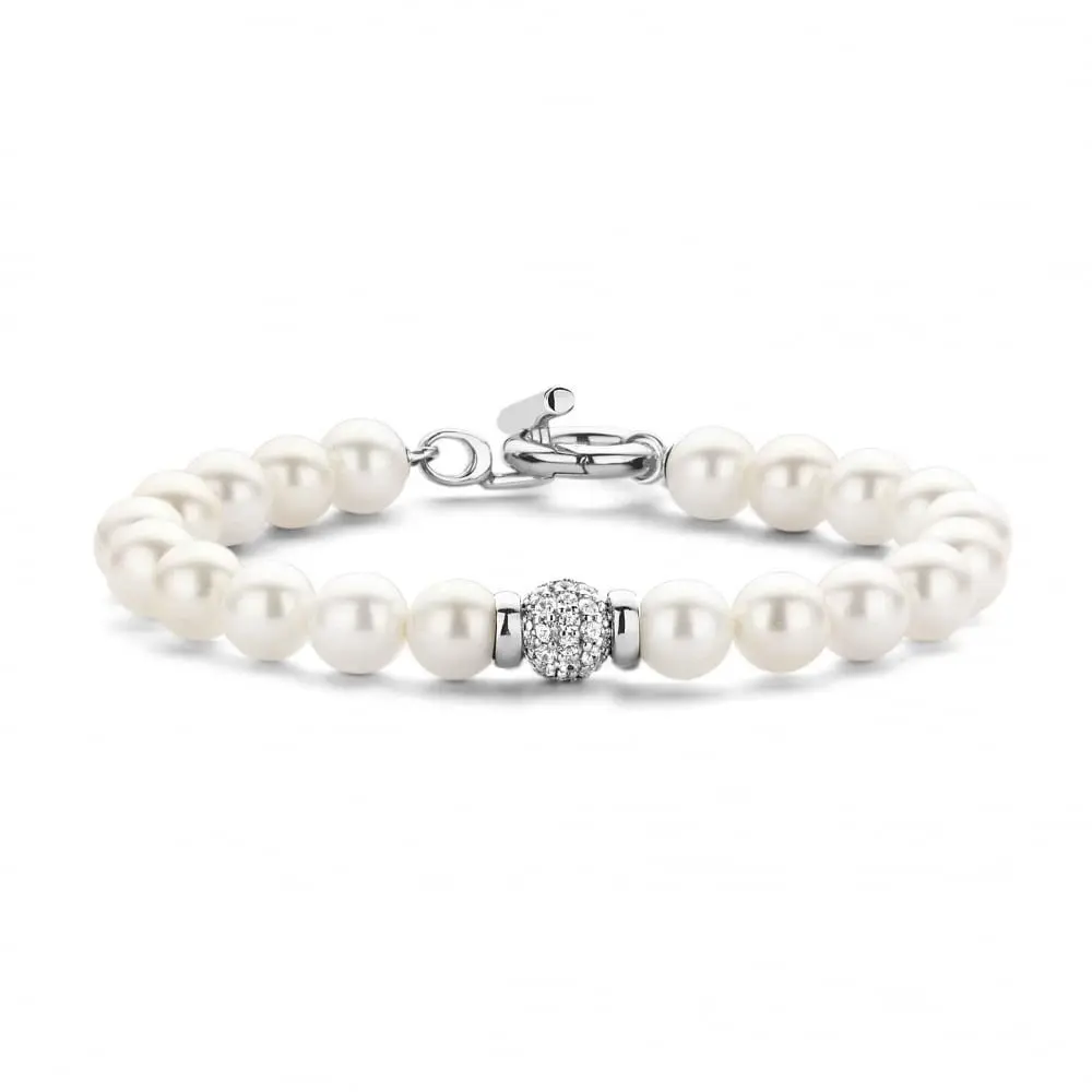Ženska narukvica brenda Ti Sento. Karakterišu je perle bele boje i privezak kružne forme optočen kristalima koji daju ovom modelu minimalistički stil i čine ga pogodnim za nošenje u svečanim prilikama.