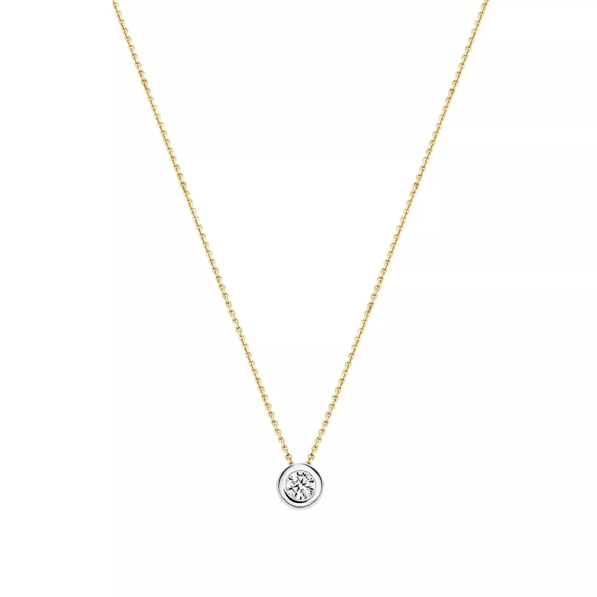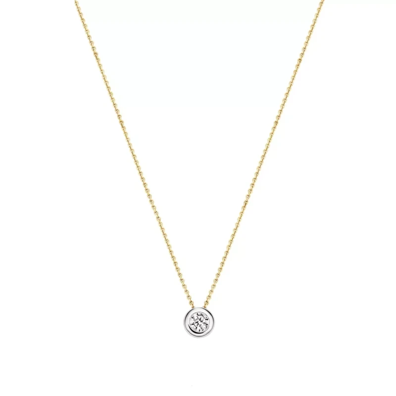 Glamurozni šarm. Ogrlica od žutog zlata od 14 karata ima privezak okruglog oblika koji se sastoji od briljantno rezanog belog cirkona prečnika 5 mm. Moderan i sofisticiran dvobojan dizajn koji se lako kombinuje sa drugim nakitom.