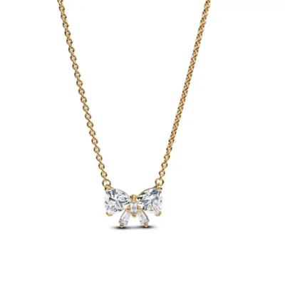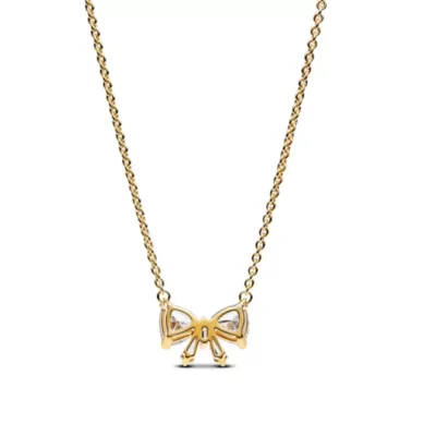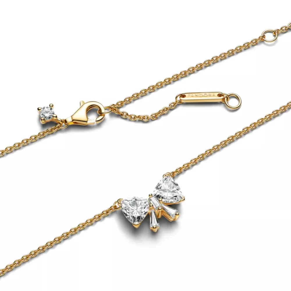 Nijedan izgled nije potpun bez mašne. Ovog puta, mašna je izrađena od blistavih kubnih cirkona, postavljenih na centralni element u obliku mašne sa 14k pozlatom, pričvršćen na podesivi lanac. Kamenčići su posebno isečeni tako da formiraju oblik mašne kada su složeni, spremni da zaokruže svaki vaš stil. Nosite ovu ogrlicu za dašak prazničnog sjaja ili je upakujte s ljubavlju za osobu koja je na vrhu vaše liste za poklone.