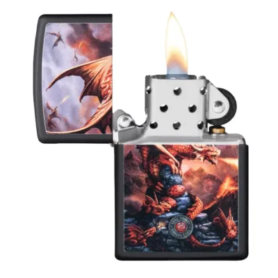 Originalan Zippo upaljač crne boje. Na modelu su utisnuti raznobojni zmajevi . Upaljači brenda Zippo prepoznatljivi su po obliku i dizajnu koji obezbeđuje jednostavnu upotrebu,plamen je postojan i otporan na vetar. Svaki model dolazi u originalnom pakovanju i idealan je poklon trajnog kvaliteta.