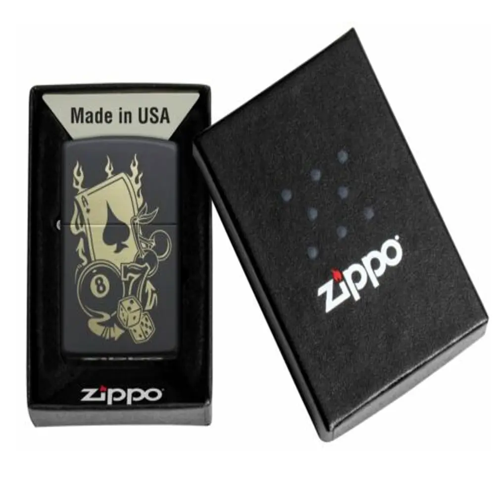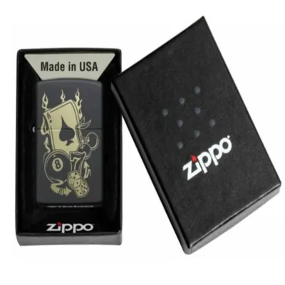 Originalan Zippo upaljač otporan na vetar sa prepoznatljivim Zippo dizajnom. Crne je boje sa motivima kockanja na prednjoj strani modela. Potvrda autentičnosti je Zippo logo utisnut na dnu upaljača. Svaki Zippo upaljač dolazi u originalnom pakovanju i idealan je poklon trajnog kvaliteta.