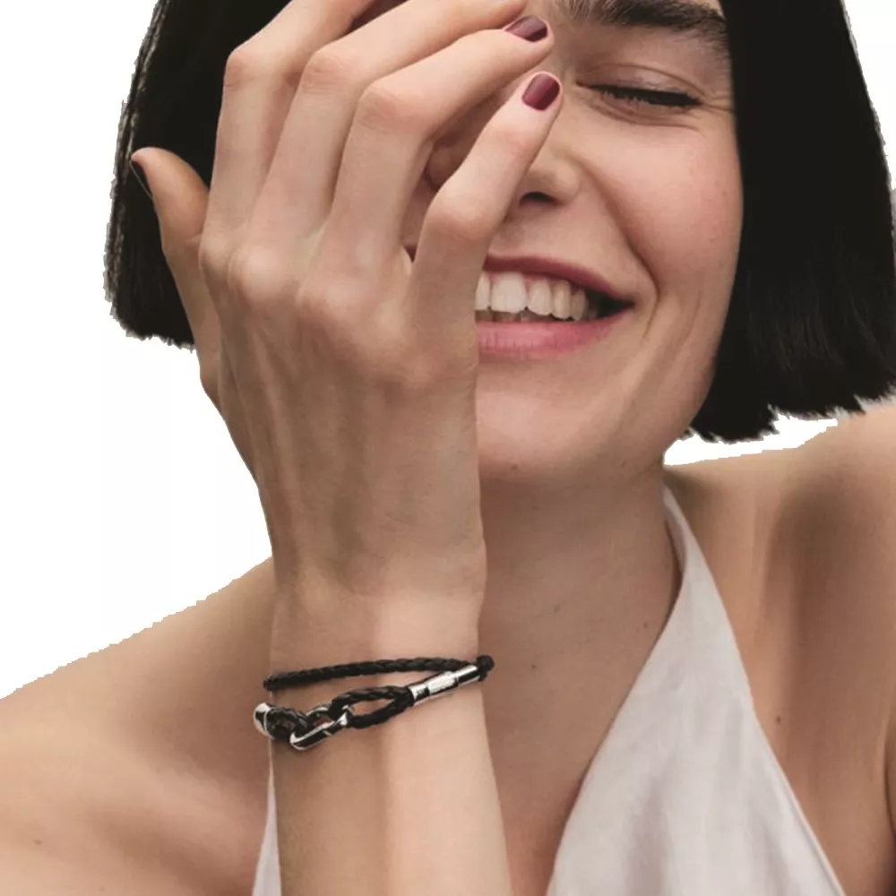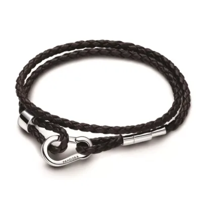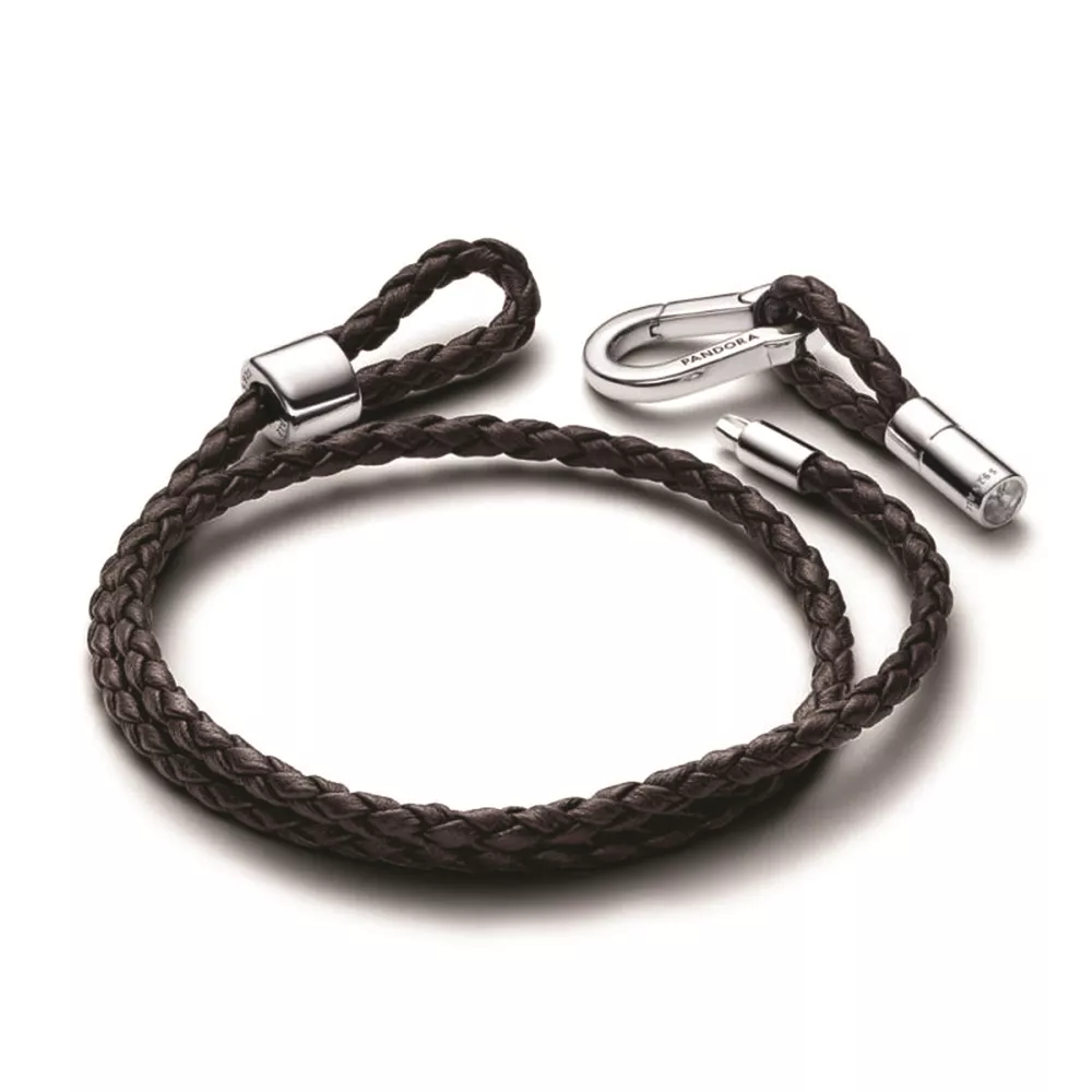 Pandora Moments braon pletena dvostruka kožna narukvica ima dvaput obavijenu braon kožu i kopču od čistog srebra koja ima ugraviran Pandora logo sa obe strane. Podesi narukvicu pomoc´u kliznog metalnog poklopca na jednom kraju narukvice; dodaj i pričvrsti priveske koristec´i metalnu kapicu koja se može otvoriti na drugom kraju. Prilagodi ovu savremenu, super nosivu narukvicu sa 16 do 18 privezaka ili visećih privezaka.