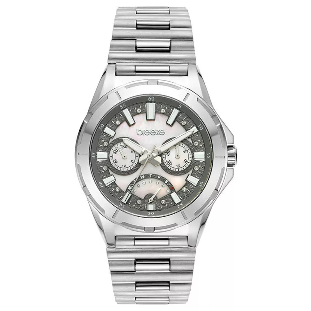 Specifičan a ujedno i atraktivan dizajn ženskog sata poznatog Grčkog modnog brenda Breez. Dizajn ovog modela sata krase čelično kućište kao i narukvica izradjeni od izuzetno kvalitetnog hiruškog čelika u boji srebra. Samo kućište krasi beli brojčanik sa sivim detaljima, sa dodatnim funkcijama, kristali, kao i logo brenda. Ovaj model je nosiv uz svaku odevnu kombinaciju kao i za svaku priliku.