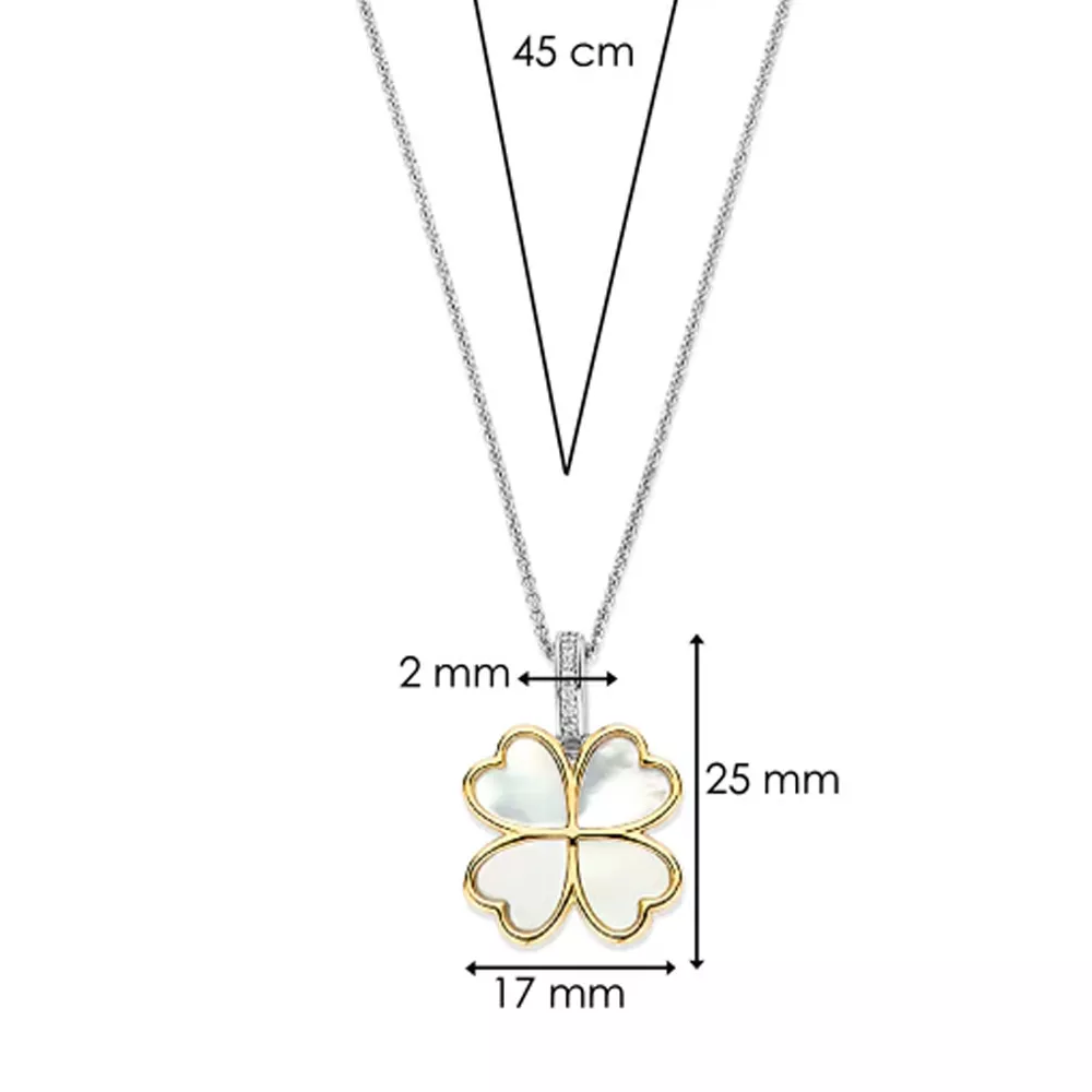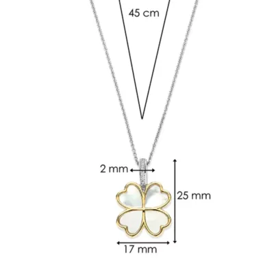 Ti Sento oglrica sa očaravajuc´om detelinom sa četiri lista uokvirena je blistavim zlatom koje naglašava meko prelamanje njenih sedefnih umetaka. Delikatan, ali upečatljiv, ovaj komad nakita savršeno spaja značenje i lepotu u savršenoj harmoniji. Privezak se može skinuti i zakačiti na bilo koju od vaših omiljenih ogrlica da biste stvorili personalizovani izgled koji je jedinstveno vaš.