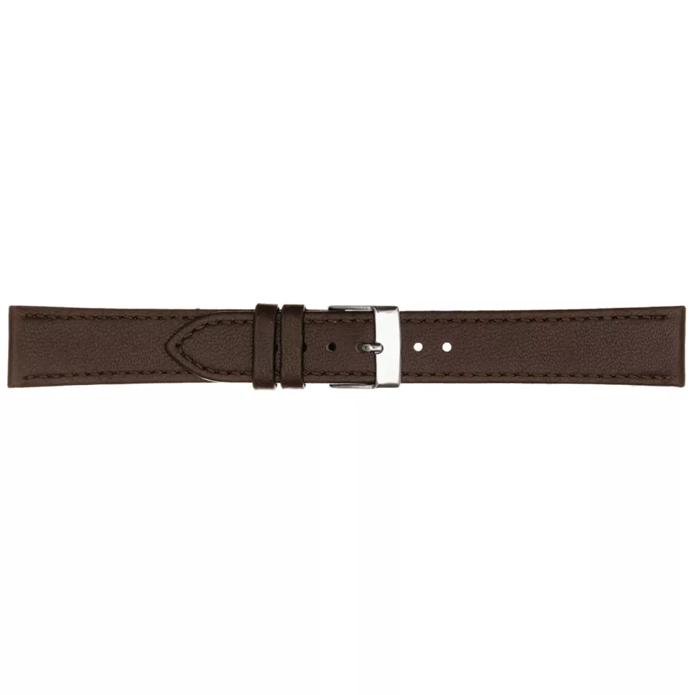 Tamno braon kaiš za sat od teleće kože širine 20mm, izrađen od vrhunske italijanske kože. Opremljen je kopčom od nerđajućeg čelika, sa unutrašnjom postavom od mikrofibera. Polustrukturisan je, sa ravnim profilom i detaljno prošiven za dodatnu izdržljivost i sofisticiran izgled.
