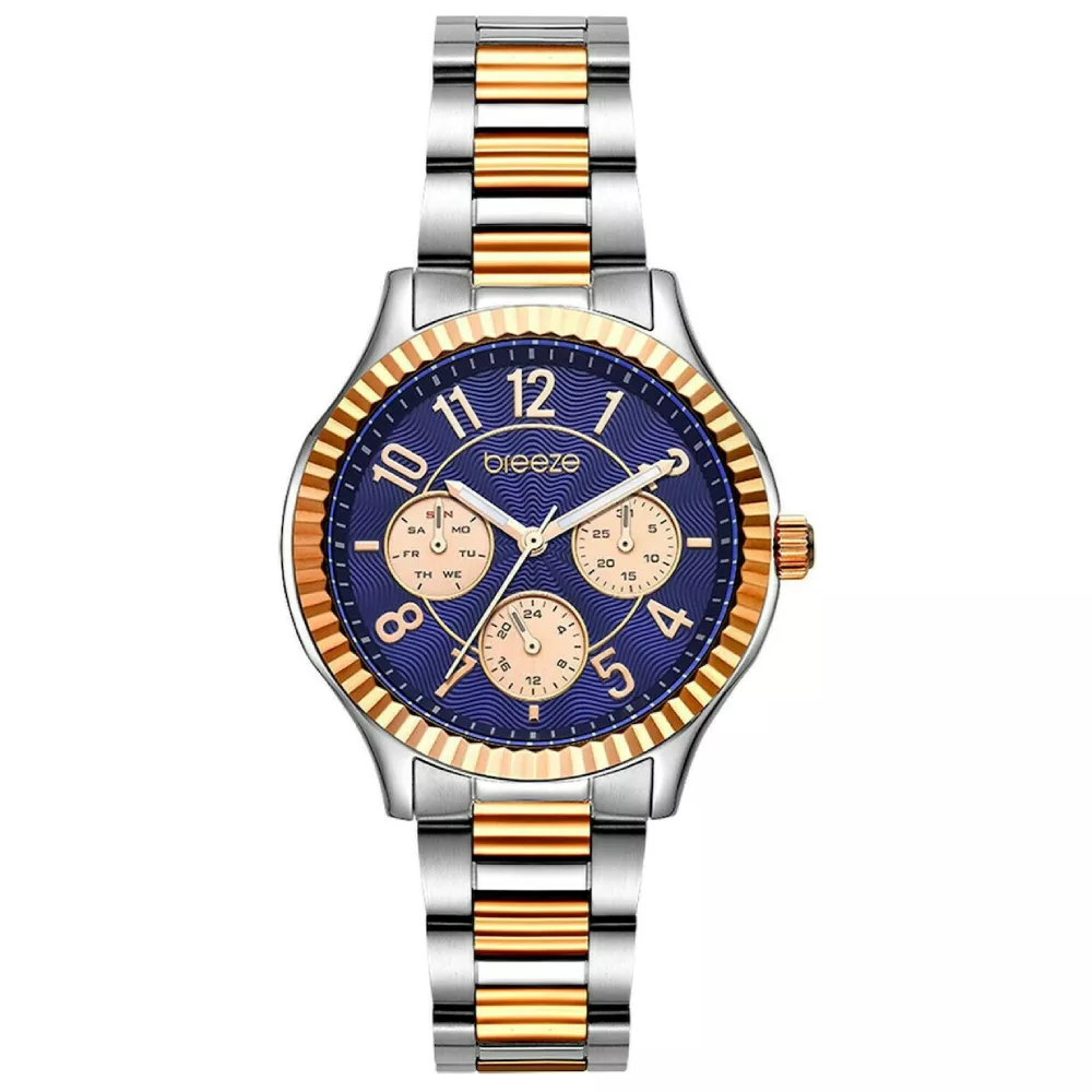 Specifičan a ujedno i atraktivan dizajn ženskog sata poznatog Grčkog modnog brenda Breez. Dizajn ovog modela sata krase čelično kućište kao i narukvica izradjeni od izuzetno kvalitetnog hiruškog čelika u boji srebra i roze zlata. Samo kućište krasi plavi brojčanik sa rose gold detaljima, sa dodatnim funkcijama, kristali, arapski brojevi kao i logo brenda. Ovaj model je nosiv uz svaku odevnu kombinaciju kao i za svaku priliku.