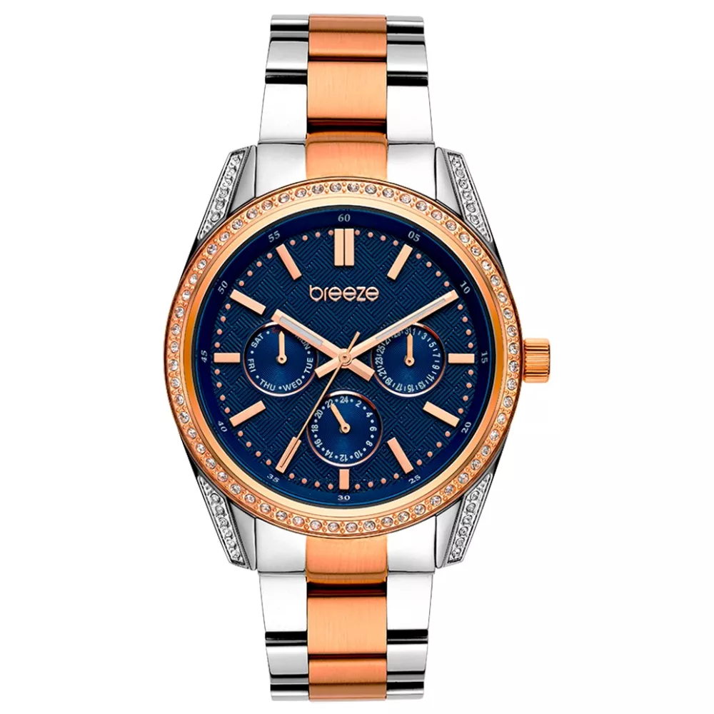 Specifičan a ujedno i atraktivan dizajn ženskog sata poznatog Grčkog modnog brenda Breeze. Dizajn ovog modela sata krase čelično kućište kao i narukvica izradjeni od izuzetno kvalitetnog hiruškog čelika u boji srebra i roze zlata. Samo kućište krasi plavi brojčanik sa rose gold detaljima, sa dodatnim funkcijama. Ovaj model je nosiv uz svaku odevnu kombinaciju kao i za svaku priliku.