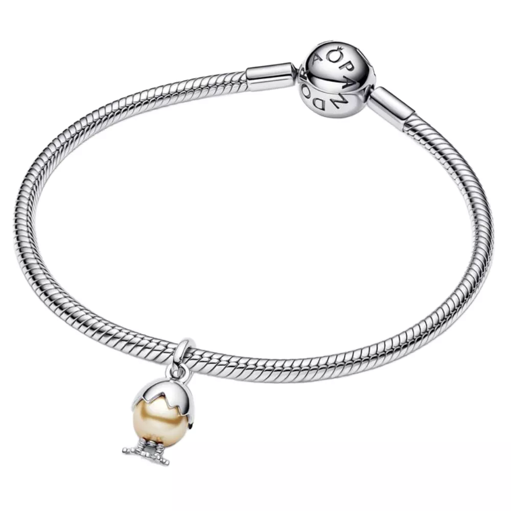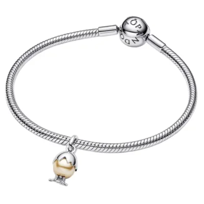 Učinite prazničnu sezonu još posebnijom uz naš Easter Egg Dangle Charm privjesak. Oblikovan kao uskrsnje jaje iz kojeg se izlegava pile, ovaj privjesak je izrađen od srebra i veštačke perle prekrivene zlatnim lakom. Na dnu privjeska nalaze se dve nogice koje izlaze iz jajeta, simbolizujući pile koje se izlegava. Kao simbol novih početaka i skrivenih blaga – stvari koje najviše volimo u proleće – ovaj privjesak je sladak dodatak svakoj kolekciji.