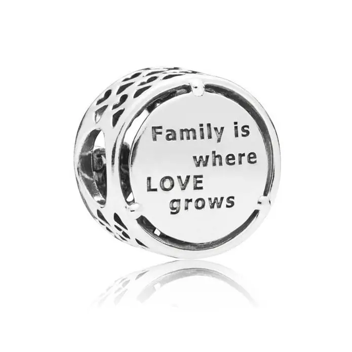 Dajte smisao Vašem izgledu ovim cvetnim granama i dubokim korenom porodičnog drveta. Izrađen od srebra, ovaj predivan komad sadrži ugraviranu poruku "Family is where love grows" i izrezbarena srca po obodu priveska.