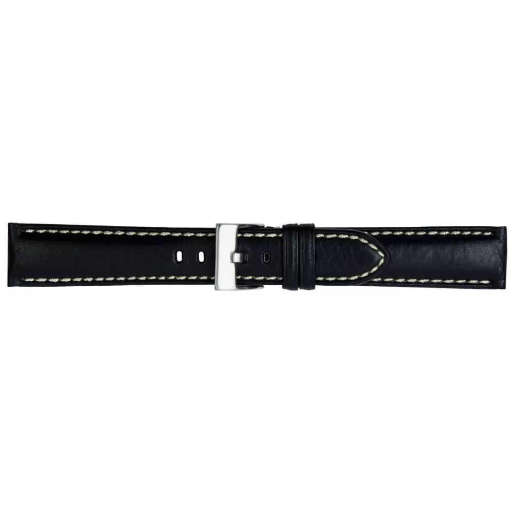Crni kaiš za sat Odessa, izrađen od teleće kože u italijanskog porekla širine 18mm. Opremljen je kopčom od nerđajućeg čelika i postavom od prirodne kože. Ima polustrukturisanu završnicu, dodatno punjenje za veću udobnost i dekorativne šavove, što mu daje sofisticiran i izdržljiv izgled.