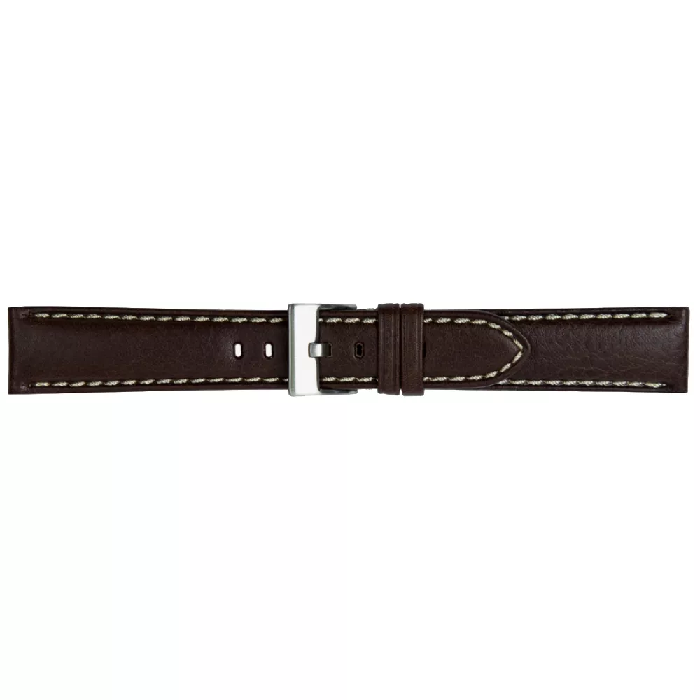 Tamno braon kaiš za sat Odessa, izrađen od teleće kože u italijanskog porekla širine 24mm. Opremljen je kopčom od nerđajućeg čelika i postavom od prirodne kože. Ima polustrukturisanu završnicu, dodatno punjenje za veću udobnost i dekorativne šavove, što mu daje sofisticiran i izdržljiv izgled.