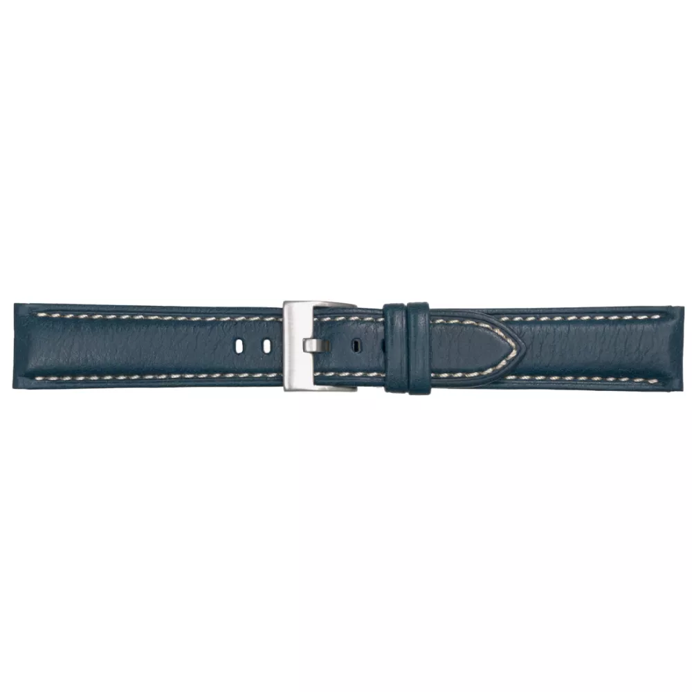 Tamno plavi kaiš za sat Odessa, izrađen od teleće kože u italijanskog porekla širine 18mm. Opremljen je kopčom od nerđajućeg čelika i postavom od prirodne kože. Ima polustrukturisanu završnicu, dodatno punjenje za veću udobnost i dekorativne šavove, što mu daje sofisticiran i izdržljiv izgled.