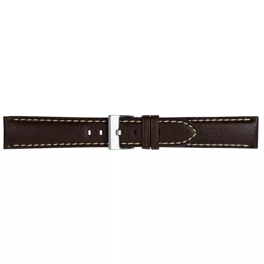 Tamno braon kaiš za sat Odessa Extra-Long, izrađen od teleće kože u italijanskog porekla širine 20mm. Opremljen je kopčom od nerđajućeg čelika i postavom od prirodne kože. Ima polustrukturisanu završnicu, dodatno punjenje za veću udobnost i dekorativne šavove, što mu daje sofisticiran i izdržljiv izgled.