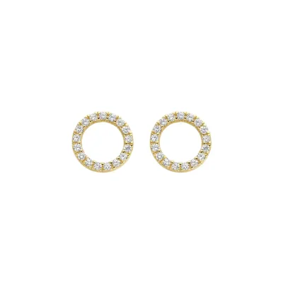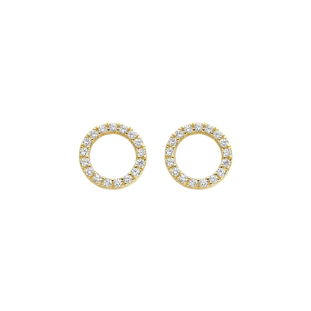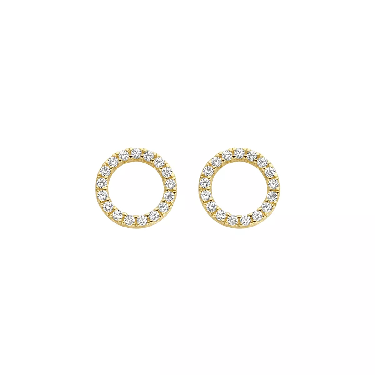 Privesci za minđuše izrađeni su od 14k žutog zlata sa svetlucavim cirkonima. Krug je prečnika 7,5 mm.