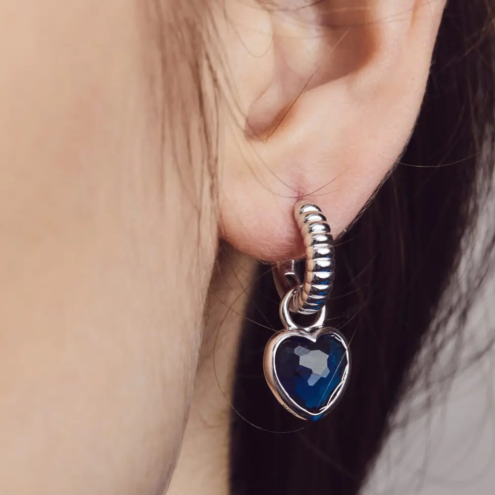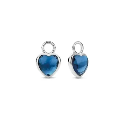 Ženske minđuše Italijanskog brenda Ti sento. Imaju dva obostrana tamnoplava kamena u obliku srca. Zahvaljujuc´i njihovom fantazijskom rezu, kamenje pogađa više svetlosti. Postavke su napravljene od 925 sterling srebra i presvučene debelim slojem rodijuma kako bi ih zaštitile i zadržale sjaj.