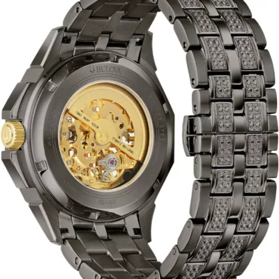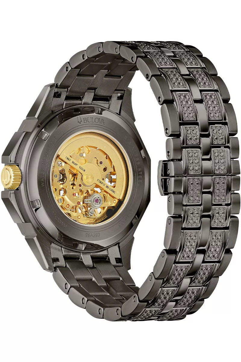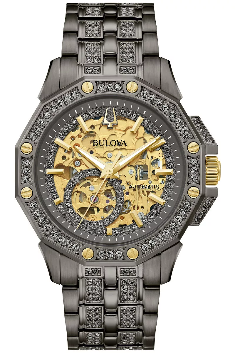 Bulova Octava Crystal Automatik muški sat ceo od nerđajkućeg čelika u sivoj boji ukrašen sa 251 sivim cirkonom. Transparentan brojčanik otkriva automatksi mehanizam sa 21 draguljem.