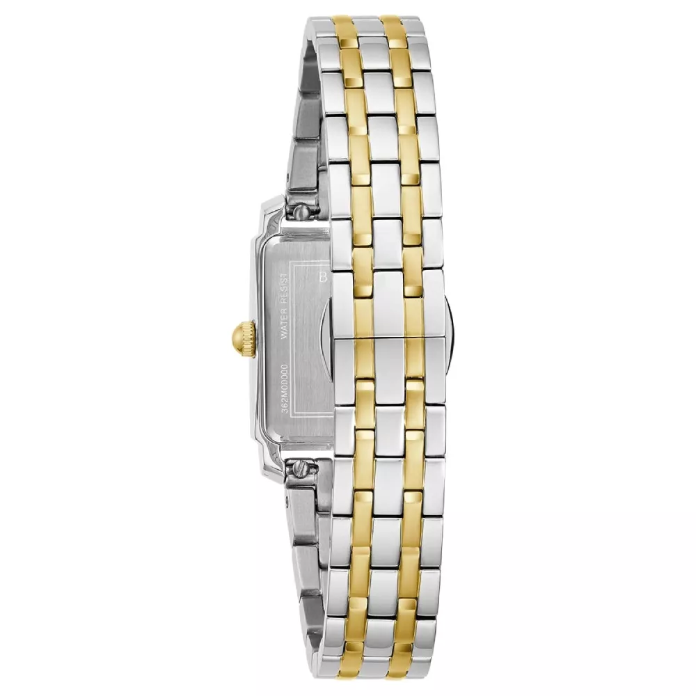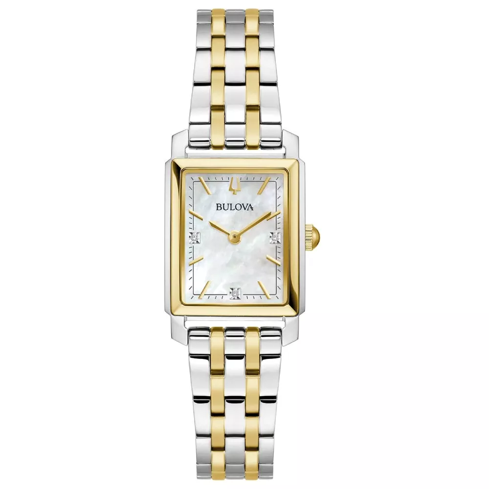 Ovaj Bulova ženski časovnik donosi novu dimenziju stila već sofisticiranoj kolekciji Sutton. Elegantno pravougaono kućište od nerđajućeg čelika u kombinaciji srebrnog i zlatnog tona savršeno je upareno sa odgovarajućom narukvicom. Sjajni brojčanik od sedefa dodatno je naglašen zlatnim markerima za sate i odgovarajućim kazaljkama, uključujući tri dijamantska markera, što ovom časovniku daje izgled prave sofisticiranosti. Ovaj ženski časovnik iz Bulova kolekcije idealan je za dame koje žele da ostave upečatljiv utisak.