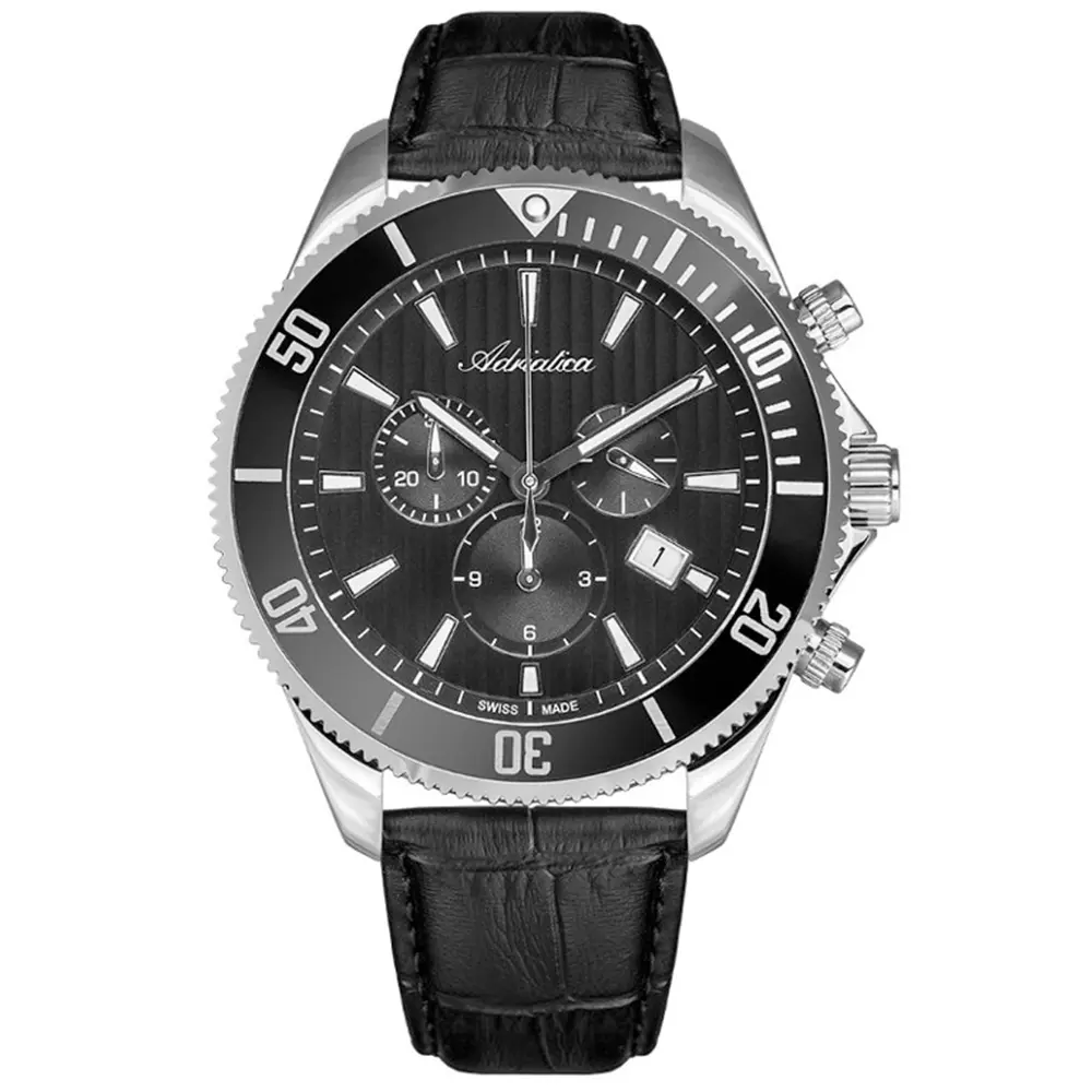 Muški ručni sat brenda Adriatica. Karakteriše ga crni brojčanik sa srebrnim kućištem, kao i visokokvalitetna crna kožna narukvica. Izraženi podbrojčanici i unidirekciona rotirajuća lineta daju ovom modelu moderan dizajn pogodan za nošenje u svakoj prilici.