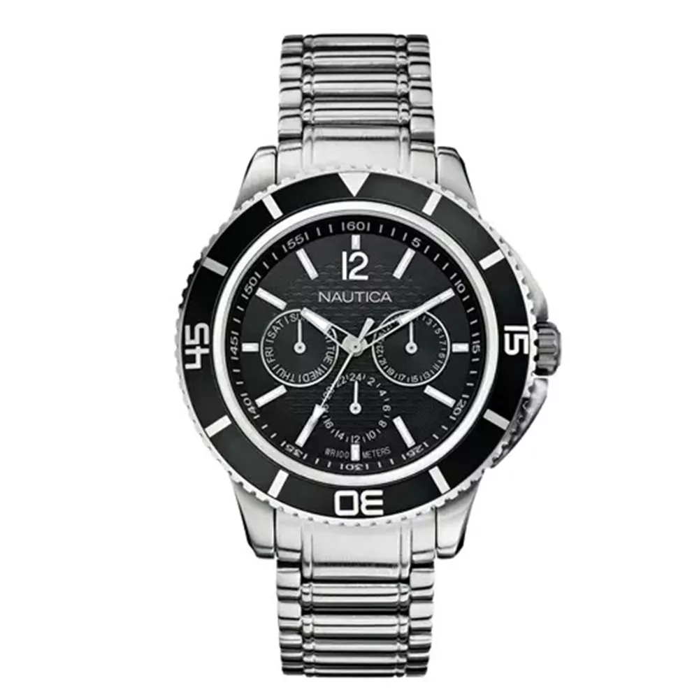 Muški sportski sat brenda Nautica ima kvalitetnu čeličnu narukvicu i kućište u srebrnoj boji sa crnom linetom. Beli indeksi i podbrojčanici smešteni na crnom brojčaniku daju kontrast i pružaju bolju preglednost i čitljivost. Ovaj model nosiv je u svim prilikama, a odlično ide uz sportske kombinacije.