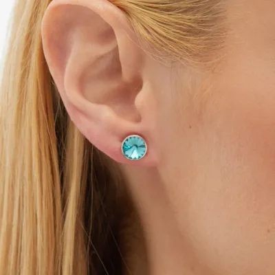 Diskretne minđuše španskog brenda Victoria Cruz, izrađene su od rodiniranog srebra sa Swarovski kristalom okruglog oblika u svetlo plavoj boji.