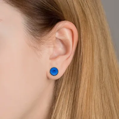 Elegantne moderne minđuše španskog brenda Victoria Cruz, izrađene su od rodiniranog srebra u zlatnoj boji sa Swarovski kristala okruglog oblika u plavoj boji.
