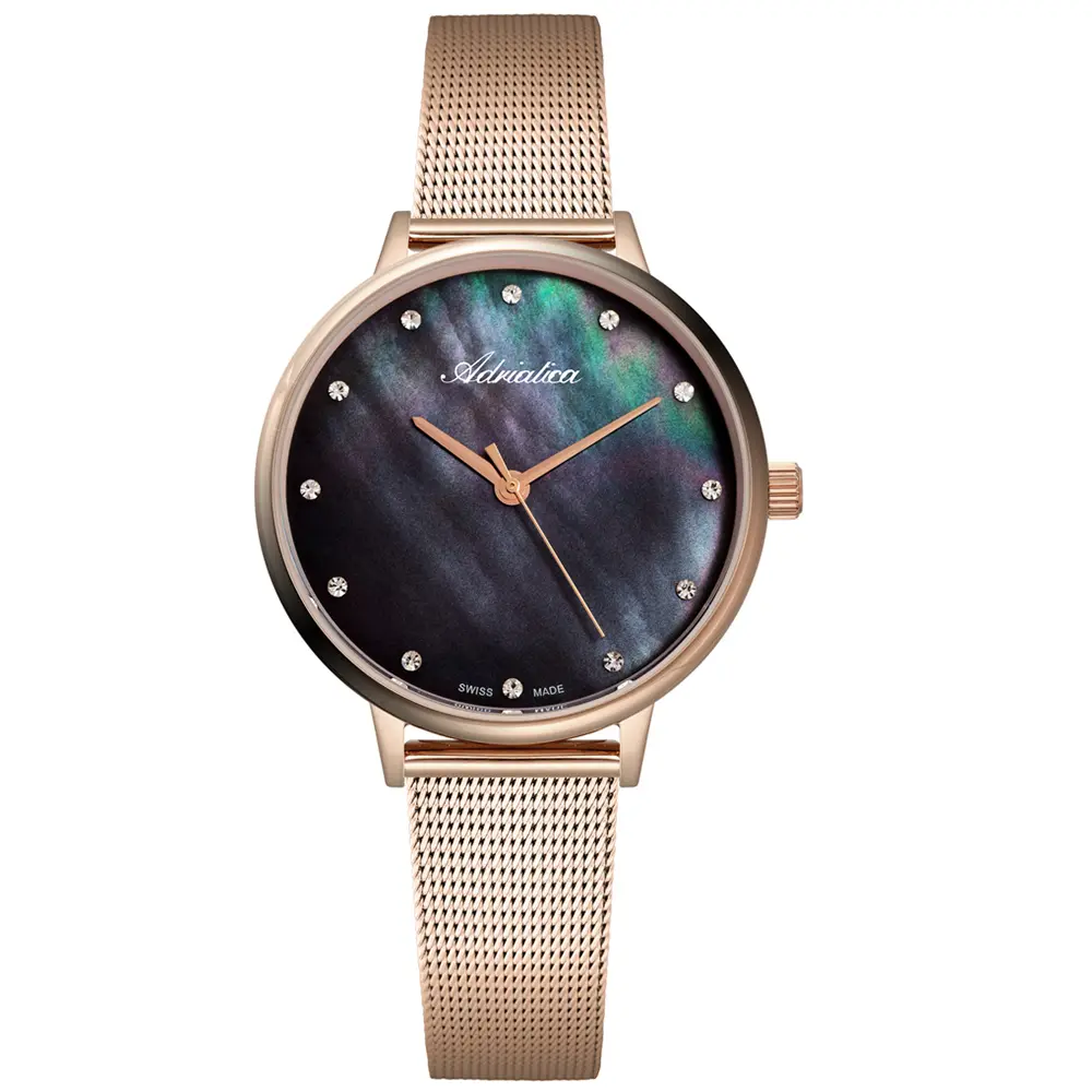 Moderan ženski ručni sat brenda Adriatica, iz kolekcije Milano. Karakteriše ga crni brojčanik sa diskretnim cirkonima, kao i visokokvalitetna roze zlatna pancir narukvica koja daje dozu atraktivnosti ovom modelu i čini ga pogodnim za svakodnevno nošenje.
