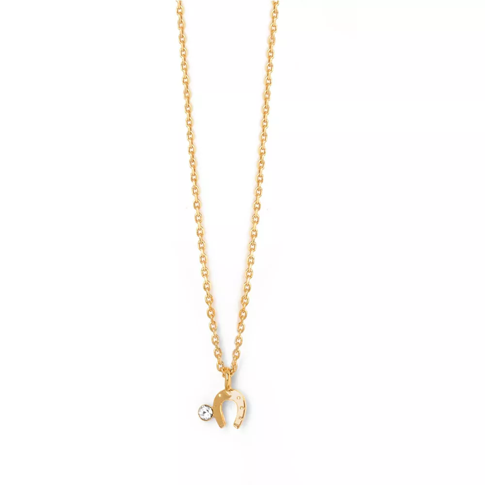 Neobična i atraktivna ogrlica sadrži privezak u obliku potkovice sa Swarovski kristalom. Izrađena je od rodiniranog srebra u boji zlata.